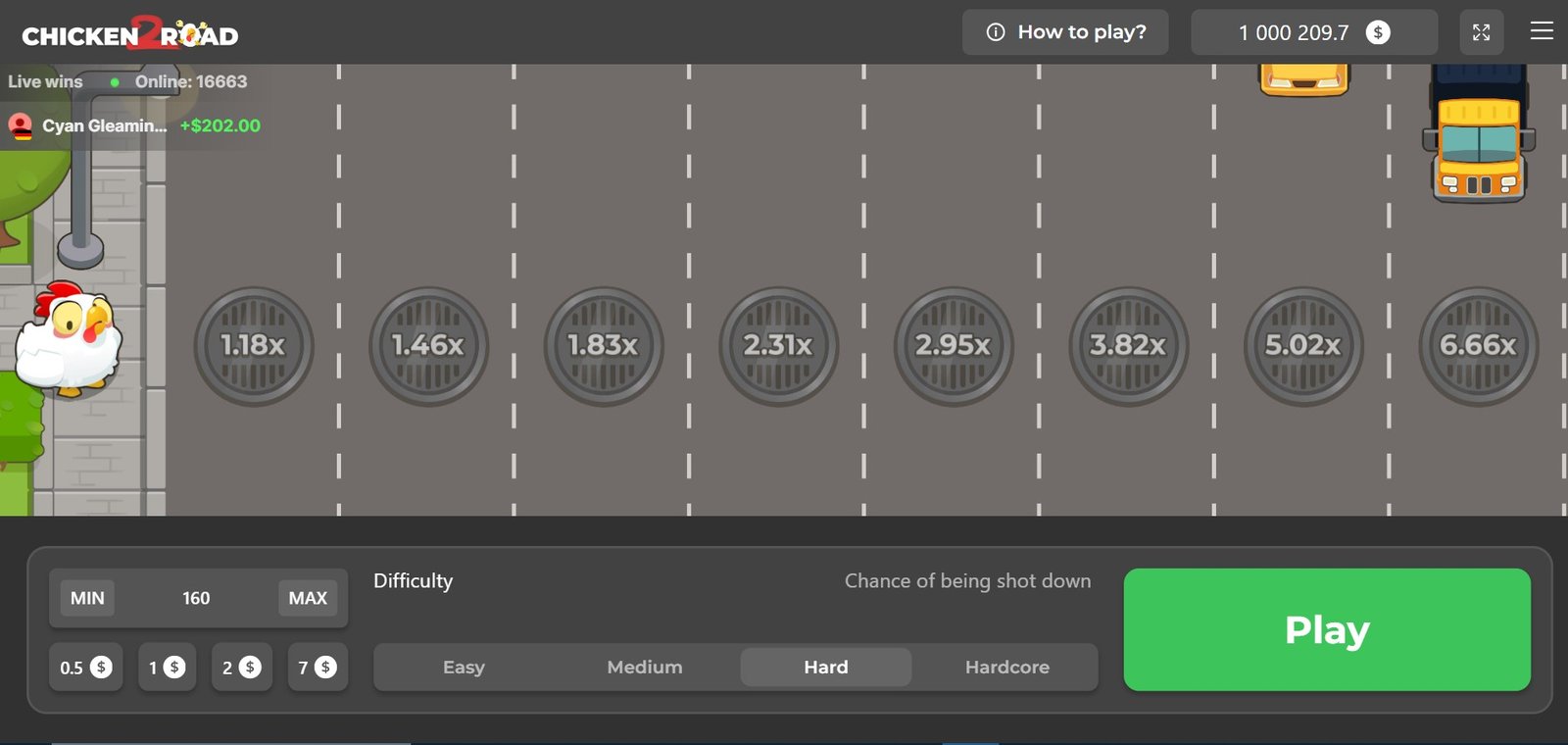 En Chicken Road 2 tienes un solo objetivo: lograr que el pollo avance lo más lejos posible entre los coches de una autopista. Por cada carril que alcances, el multiplicador de tu apuesta inicial aumentará.